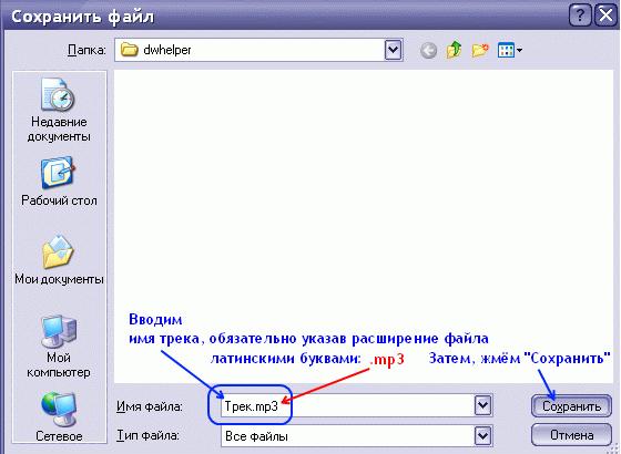 После нажатия, откроется диалоговое окно, в котором, необходимо выбрать место для сохранения трека, а так же, дать ему имя и обязательно в конце дописать расширение .mp3, например: Трек.mp3, и нажимаем кнопку "Сохранить".