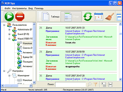 «Как он работает?» - с удивлением скажете Вы, когда получите письмо с подробным отчетом о работе пользователя на компьютере от KGB Spy на свой электронный ящик. KGB Spy справляется со своими обязанностями даже лучше чем знаменитый агент 007 Джеймс Бонд.