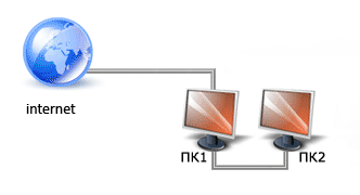 Рассмотрим самый классический вариант – у вас 2 компьютера, они соединены между собой в сеть и один из них подключен к Интернету.