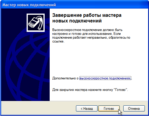 7. Перед нами последнее окно Мастера новых подключений - нажимаем кнопку «Готово». Закрываем браузер Internet Explorer.