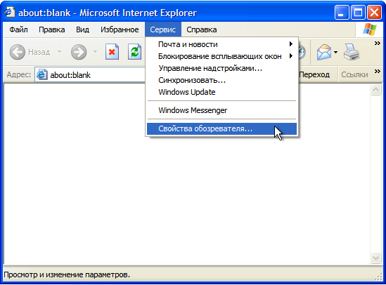 1. Запускаем браузер Internet Explorer. В меню «Сервис» выбираем пункт «Свойства обозревателя».