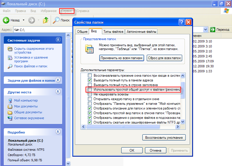 Прежде всего, в меню «Сервис» окна Локальный диск (в котором вы создали общую папку) выберите вкладу «Вид» и снимите галочку на пункте «Использовать простой общий доступ к файлам (рекомендуется)». Нажмите «ОК».
