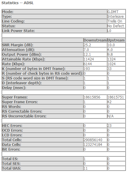 Здесь нас интересует достижимая скорость соединения Attainable Rate и текущая скорость Rate. Если эти значения малы или не соответствуют договорным обязательствам провайдера или скорости выбранного тарифного плана - то произойти это может по двум причинам: или провайдер искусственно ограничил скорость для Вашего подключения (из за высокой загруженности каналов), или Ваша телефонная линия не соответствует техническому минимуму для высокочастотного ADSL-соединения - смотрим параметры SNR MARGIN и Atteniation. Вот таблица с допустимыми значениями этих параметров: