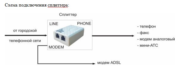 Разъем MODEM должен быть соединен с модемом, и, между сплиттером и модемом не должно быть подключено других устройств (телефонных аппаратов). Кабель, соединяющий сплиттер с модемом должен быть минимально коротким, причем, сворачивать "в бублик" и комкать его нельзя.