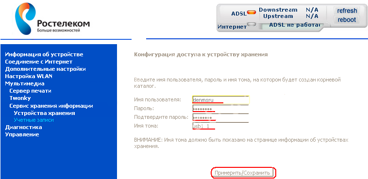 Адрес веб-интерфейса роутера по-умолчанию http://192.168.1.1, логин для доступа admin и пароль admin, если конечно его не сменили при настройке. Идем в раздел Мультимедиа > Сервер хранения информации: