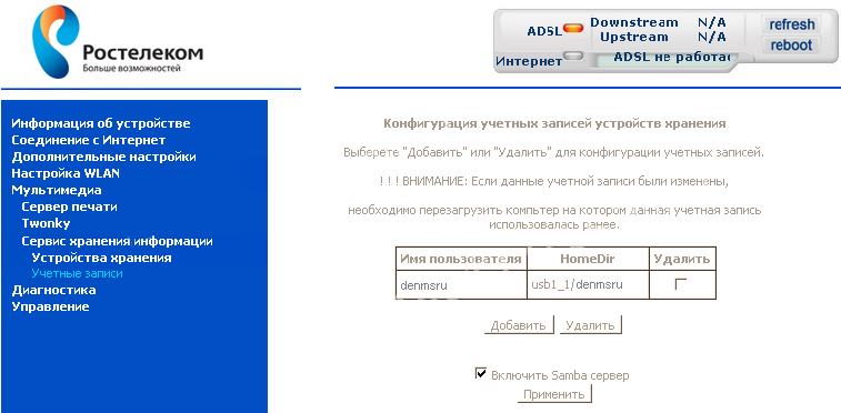 В поле Имя пользователя указываем любое имя в латинской раскладке, а в поле Пароль и Подтвердите пароль — вводим произвольный пароль на доступ — им может быть любая буквенная, цифирная или смешанная последовательность символов. Под этой учетной записью мы будем заходить на встроенный Samba-сервер Sagemcom 2804. В поле имя тома указываем имя из таблички выше — usb1_1. Нажимаем кнопку Применить/Сохранить. Нас вернет назад, в Учетные записи.