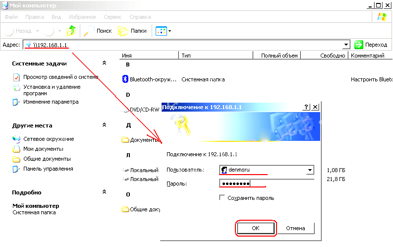 В операционной системе Windows в строке адреса проводника вводим адрес: \\192.168.1.1 и нажимаем кнопку Enter.