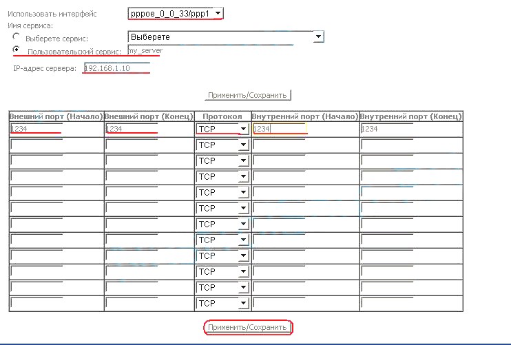 В поле Использовать интерфейс выбираем wan-интерфейс, который поднимает сессию (в нашем случае это PPPoE). Затем в поле IP-адрес сервиса прописываем IP-адрес компьютера, для которого пробрасываем порт.