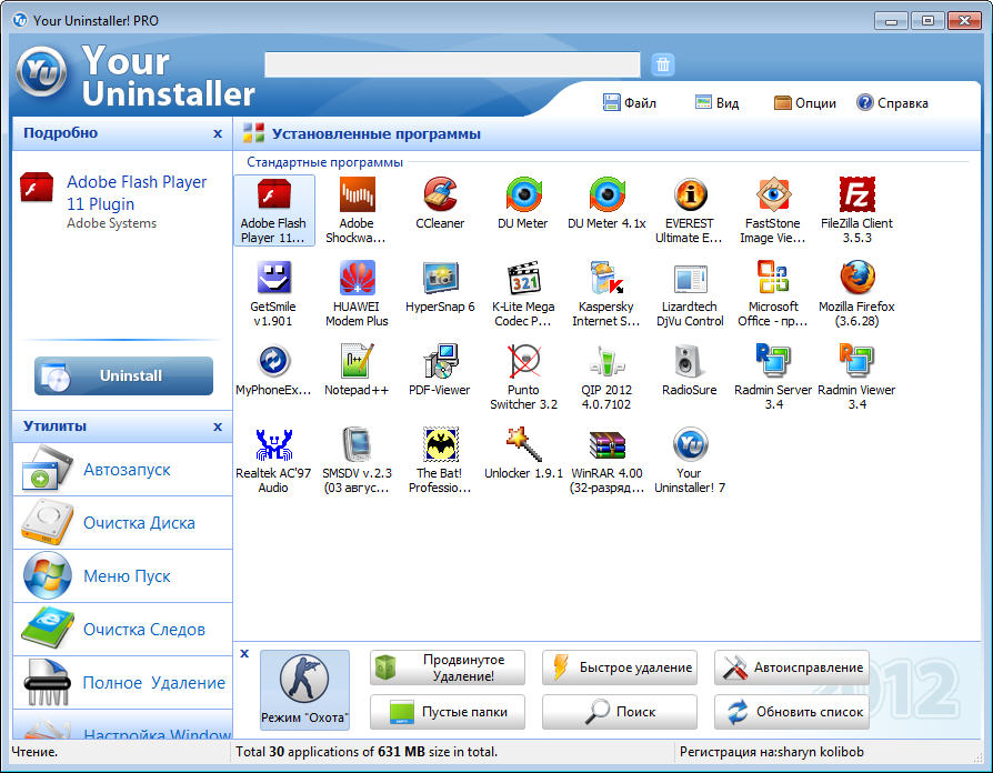 Your Uninstaller обеспечивает решение задач по деинсталляции приложений, установленных на вашем компьютере. Подсвечивает недавно установленный «софт» и автоматически вычищает оставшиеся после удаления ключи реестра и файлы. Уборка мусора, впрочем, одними приложениями не ограничивается. Также можно запросить список автоматически загружаемых программ и контекстное меню Internet Explorer. Может показывать соответствующие значки приложений. Имеется функция поиска приложения по ключевому слову. Автоматически обнаруживает неисправные ключи реестра и полностью удаляет их по вашему разрешению.